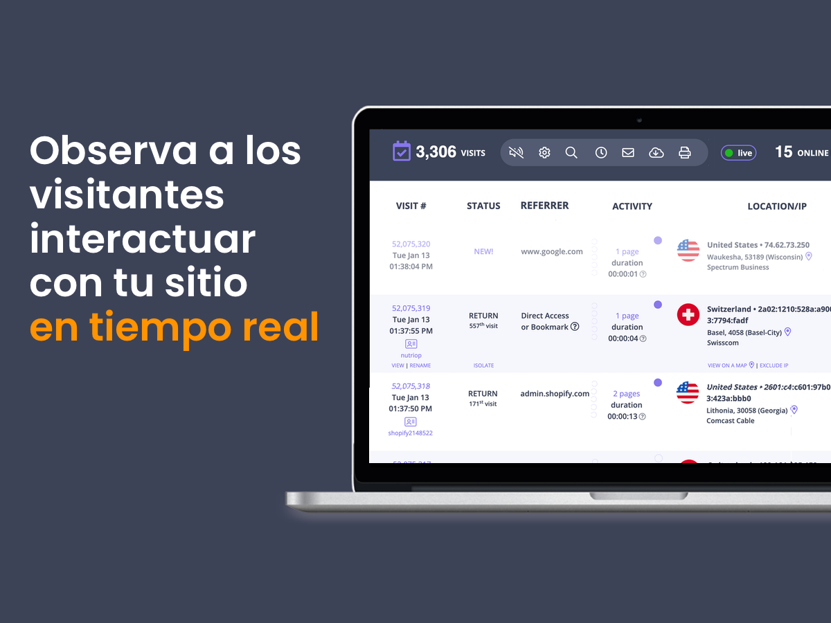 Seguimiento en vivo de interacciones: sigue a los visitantes durante toda su visita en tiempo real. Descubre cómo navegan por tus páginas, dónde pasan más tiempo y cómo interactúan con tu contenido — en el mismo momento en que ocurre.